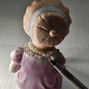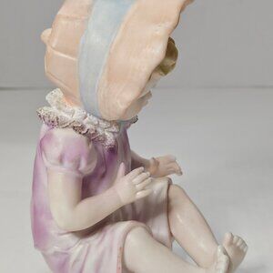 Vintage 1950s Piano baby by Arnart 5th Ave. This is a large piano baby measures 6.25 inches high, 4.5 inches. She has a pastel pink large bonnet with blue ribbon covering her gold curly locks. Piano baby has on a lilac short sleeve dress with a lacy porcelain biscuit collar. This baby is in excellent vintage condition but sadly, her bisque collar at the base of her head is missing a small suction of the bisque ruffle. See my photo pointing this out with the pen. Because of this flaw I have slashed the price down. Retail for one like this is $35 No damage. Non smoking pet free home. @ BR #4