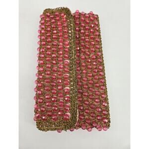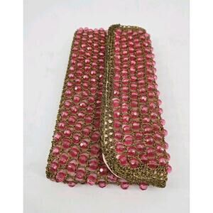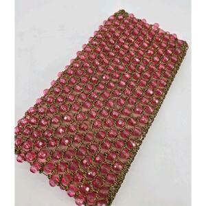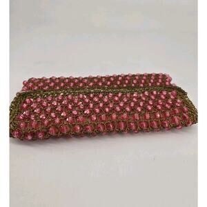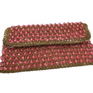 Vintage 1950s Pink Beaded Barbara Lee Italian Gold Crochet Knit Clutch Purse Bag