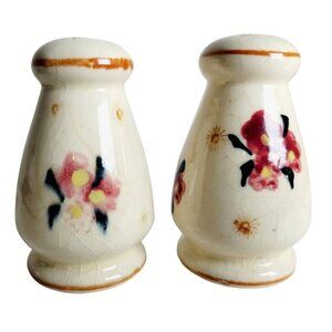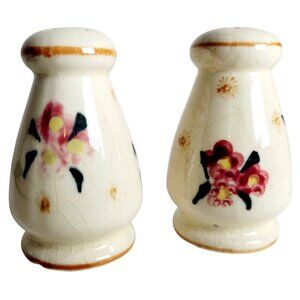 These charming 1950s salt and pepper shakers were made in Japan and feature a hand-painted floral design. Add a touch of vintage elegance to your table setting.