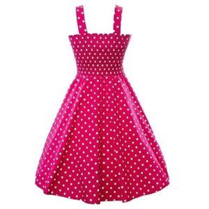 This is a vintage 1950s style polka dot swing midi dress. Featuring a fold over, sleeveless, and elastic back. Wide spaghetti straps - about 1.25" wide. Material: 90% Cotton 10% Spandex. Women's Slim Fit. Made in USA. Color: Fuscia Pink. Note: no padding