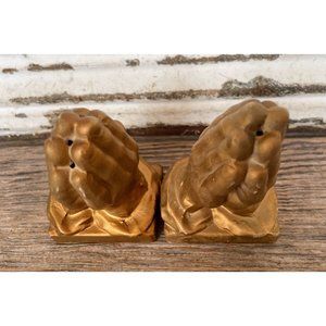 Vintage 1950s Praying HAnds Salt and Pepper Shakers Antique Gold Ceramic