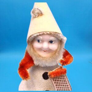 Add a touch of vintage charm to your holiday decor with this 1950s Putz elf ornament. Featuring red chenille, a foil stocking, and mica accents, it boasts a delightful off-white flocked hat, crafted in Japan.