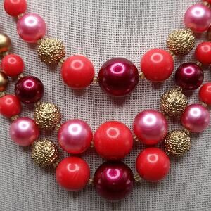 Vintage 1950s Red Pink Gold Beaded Necklace, Three Strands, Gold Tone, 15 Inch