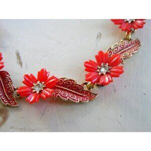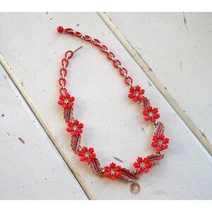 Vintage 1950's Red Poinsetta Floral Celluloid Rhinestone & Enamel Necklace