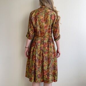 Meet the statement floral of the fall season! Vintage dress features a collared neckline with 3/4 cuffed sleeves. Functional brown plastic buttons down the bodice with a hidden snap closure and eye and hook at the waist. Pleated skirt. Fabric is composed of a green background with a brown and orange roses print. Dress is not lined. Light weight. Label is McArthur Limited. No stretch. Fabric content is silk. Dress is in excellent condition. Freshly cleaned and ready to wear!