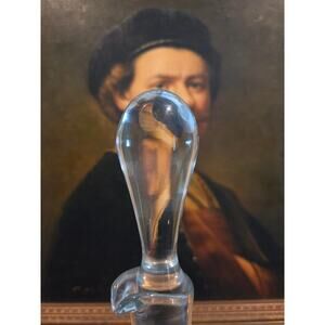 Blown clear glass with wheel-etched decoration; solid glass stopper.