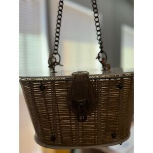 See photos for condition. Top Lucite cover has scratches and a small chip. I’m not sure if the ties around the handles are original. The wicker appears to be in great condition.