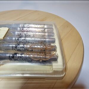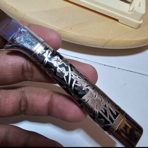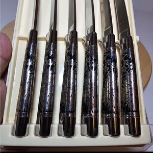 Vintage 1950s Set 6 Carvel Hall Fine Cutlery by Briddell Steak Knives In Case handle decorative foil is begining to peel and lift up in areas making it uncomfortable to the touch due to the age see pictures for reference sold as is