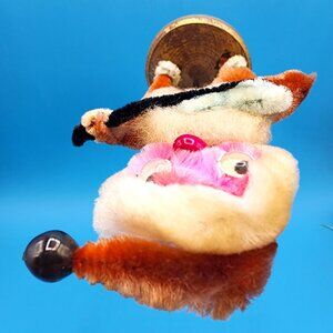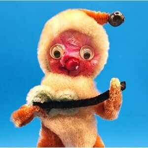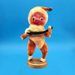 Adorable vintage 1950s shabby chenille Santa ornament made in Japan. This whimsical Putz-style Christmas figure features a red nose, black stovepipe hat, and playful googly eyes while holding a miniature guitar. A perfect touch of mid-century holiday charm for your tree, shelf, or Santa collection.