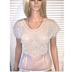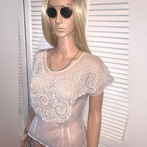 This elegant top features intricate embroidery, squiggly lines and white beading with no breaks or beads missing, perfect for adding a touch of sophistication to any outfit. Ideal for both casual and formal occasions. You could pair with a black bra for a sexy look. See example photo