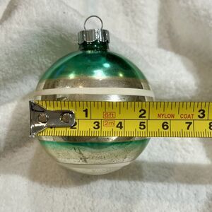 This vintage ornament is a small, round Shiny Brite mercury glass piece from the 1950s, featuring a striped pattern in multicolor. Handmade in the United States, this Mid-Century Modern ornament stands at 3 inches tall and is a nostalgic piece of art glass that brings a touch of the 1950s Christmas charm. Perfect for adult family members, this original Shiny Brite collectible is a unique addition to any holiday decor, celebrating the vintage style of the mid-20th century.