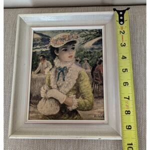 The product is a vintage 1950's signed lithograph print by artist Jeffe Huldah titled "Tavern On The Green." This portrait-oriented artwork features a small size of 8 inches length and 9.5 inches height, showcasing a multi-color floral and feminine theme in the Art Deco style. The original lithograph print is framed and made of cardstock and paper materials, reflecting the impressionism and vintage style popular during the 1925-1949 period.