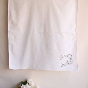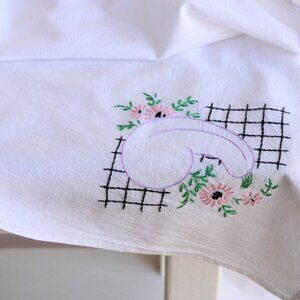 Utterly charming vintage tablecloth or perhaps kitchen towel. It could really be used for either. Flour sack cotton embroidered with an eggplant. Ends are hem stitched. It measures 35" by 32". Excellent vintage condition, some minor yellow smudges so faint they did not show in photos. Has been gently laundered and ironed by yours truly.
