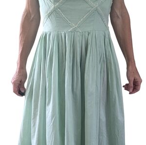 Step back in time with this vintage 1950s Tailored Junior fit & flare dress in a soft mint green hue. This retro sleeveless midi dress features a feminine fit & flare silhouette, pleated full skirt, and intricate crisscross bodice detailing with delicate trim. The back has a deep V-neckline with a side zipper for closure, making it both classic and elegant.