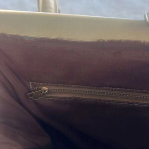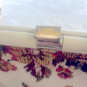It is spacious with a top frame closure leather (I think it’s real) handles and reverse floral trimmings. Amazing craftsmanship vintage and timeless patterns. Both functional and a