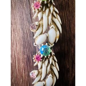 This stunning vintage necklace from the 1950s features creamy white navette thermoset cabochons arranged in a flowing, leaf-like gold-tone setting. Adorned with vibrant pastel rhinestones in shades of pink, blue, lavender, and iridescent AB (aurora borealis), this 17.5” choker-length piece exudes mid-century glamour.
