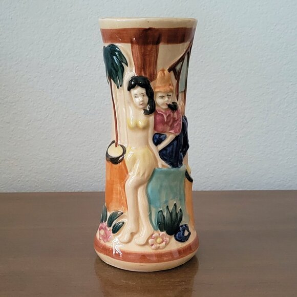 Fantastic vintage mid-century ceramic vase featuring a raised figural tropical island scene with palm trees and island figures. This piece has a strong tiki bar / Polynesian pop / tropical décor aesthetic and fits perfectly with mid-century tiki and retro island styling.