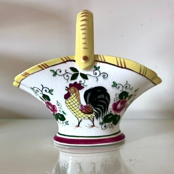 Charming vintage Ucagco Japan ceramic basket featuring a vibrant hand-painted rooster and roses design