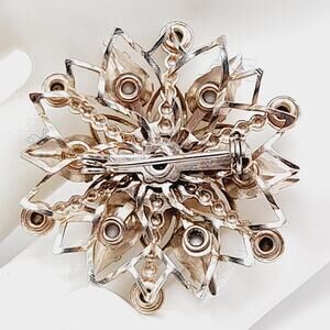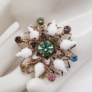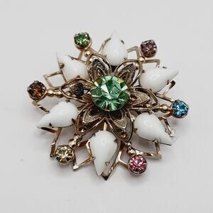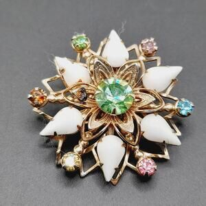 Step back into the glamour of the 1950s with this dazzling vintage starburst brooch. The centerpiece is a glowing uranium glass rhinestone that comes alive under UV light, surrounded by milk glass teardrop cabochons and colorful rhinestone accents. Set in a gold-tone filigree frame, this piece sparkles with mid-century charm. Measuring 1 1/2 inches across, it is the perfect size to wear on a lapel, scarf, or hat. A true collectible for vintage jewelry enthusiasts and a striking statement pin for any outfit.