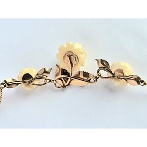 A beautiful Van Dell piece presumed to be from the 1950s. Photos show details. Approx 16 inches in length. Marked "Van Dell" and 1/20 12k indicating that it is a gold fill piece (heavier layer than plate). The gold has a rose hue to it. The ivory colored rose material is unknown.