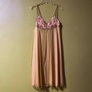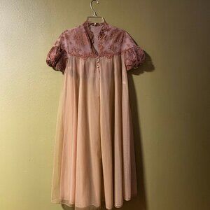 This exquisite vintage Vanity Fair nightgown and robe set embodies mid-century elegance and romantic charm. Crafted from soft, sheer nylon tricot with delicate floral lace detailing, it features a beautifully scalloped lace bust in blush pink and taupe, complemented by a flowing peach skirt with olive green lace trim. The matching robe echoes the same lace motif, complete with puff sleeves and covered buttons for a timeless, feminine silhouette.