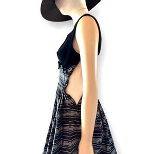 Fitted sleeveless bodice in soft black velvet, paired with a structured striped cotton skirt in a classic mid-century silhouette.