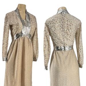 Extremely rare VTG Victor Costa 50s-60s Pale Gold Metallic Maxi long Gown with silver sequins and trim