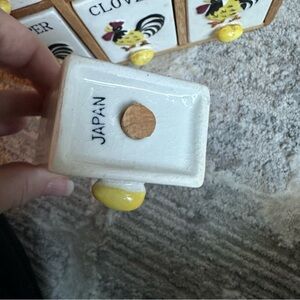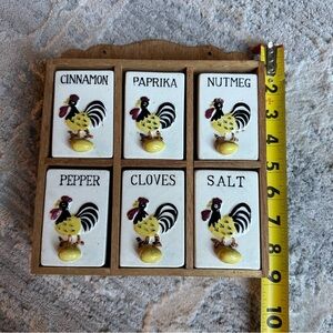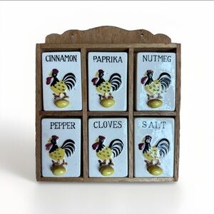 Vintage 1950s Wall Mount Spice Rack Set Wood Frame Retro Rooster Spice Jars