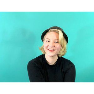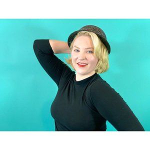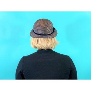 A vintage 1950s straw wicker hat in a kinda weird hard to describe charcoal brown colored wicker with a dark navy blue almost black velvet trim around the base. In the bright studio lighting the color takes on a black/gray tone but in darker lighting it is different. Has a small brim.