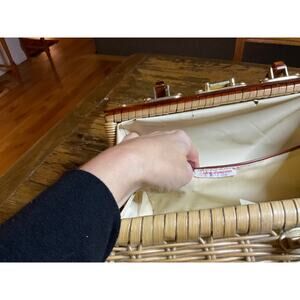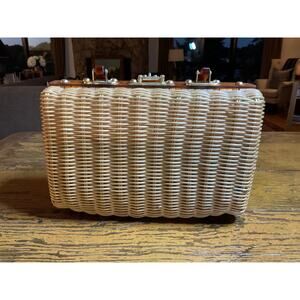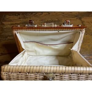 Good vintage condition overall. Minor age wear to interior lining and small surface marks consistent with age. Exterior wicker and lucite are clean and bright. Latch works securely.