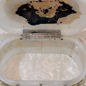 Condition: Preowned vintage in good condition has some wear. The interior had a mirror but it broke so it has sticker residue still inside. And the clasp in front has a chip. Super cute bag, great conversation piece and perfect for a costume.