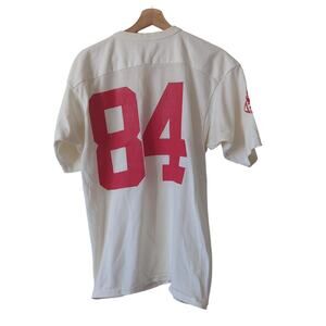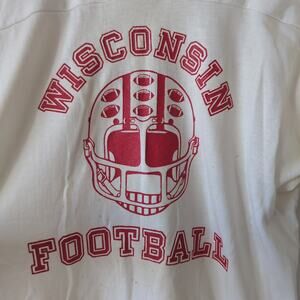 vintage Wisconsin football jersey size large champion tag 50% cotton 50% nylon University of Wisconsin bears made in USA number 84 back this could be an authentic football jersey worn by a player 1950s? has some staining from age however in really sturdy condition length 28th pit to pit 21.5