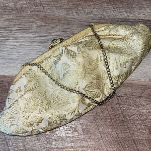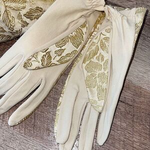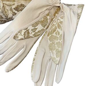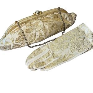 Vintage 1950’s Womens Metallic Jacquard Chain Handle Clutch and Gloves Gold Crea