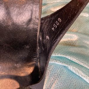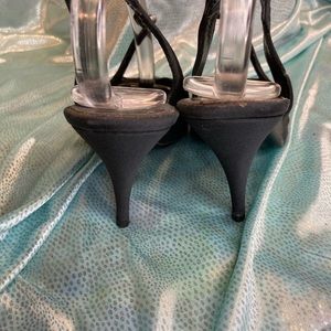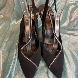 Vintage 1950’s black Matte satin sling backs with crystal accent. Size 6. Box 17