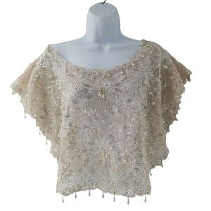 This stunning vintage cream cape/collar from the 1950s-1960s is hand-embroidered with intricate beadwork and iridescent sequins. With its elegant scoop neckline and timeless design, it makes a beautiful accessory for formal occasions or vintage collectors. No closures and unlined, adding a delicate touch to its vintage charm.