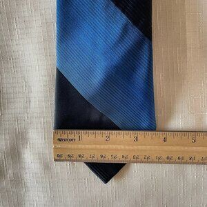 This vintage tie by Fashion Craft is crafted from 100% Terylene polyester fiber. Featuring a striking blue and black striped pattern, it adds a touch of retro elegance to any outfit. The tie measures 55 inches in length and 3.5 inches in width, making it a versatile accessory for various occasions.