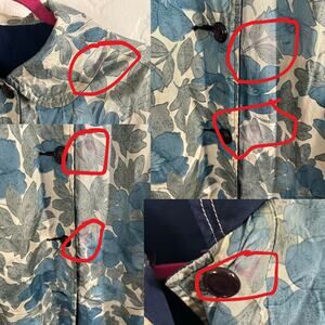 Condition: The floral side shows scattered stains/marks and a small tear at the lower back lining (see photos). The navy side presents cleanly and wears beautifully.