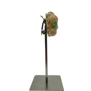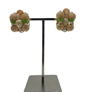 These charming vintage clip-on earrings from the 1950s feature a playful pineapple-inspired design with orange, green, and cream beads set on a gold filigree base. Signed "Made in Japan," these earrings measure 1" in circumference and are in very good vintage condition. Perfect for adding a touch of fun, retro style to any outfit.