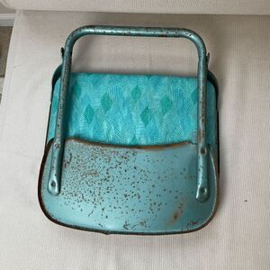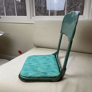 Keywords: mid-century modern, mod pattern, retro sports gear, teal decor, atomic age, 1950s stadium chair, vintage folding seat, patina charm, dopamine decor, cottagecore porch, bleacher chair, campcore, nostalgic Americana, functional vintage, colorful seating.