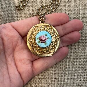 Vintage 1950’s Unsigned Gold Tone Large Enamel Painted Flower Locket Necklace