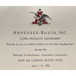 Step back in time with this vintage 1952 Anheuser-Busch invitation from the National Confectioners' Association Convention. This piece of history offers a glimpse into the corporate hospitality of the past, complete with its original envelope. It's an intriguing find for collectors of brewery memorabilia or mid-century corporate ephemera.