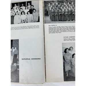 This yearbook is full of sweet notes from friends and classmates to a popular girl who was once in the running of that years beauty queen! This yearbook comes with a few saved newspaper clippings about school events and a receipt. Shows some signs of minor wear and yellowing from age. Spine is intact with a crack down the center. Measures 10 3/4" by 8".