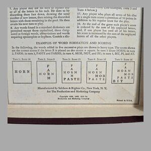 This is a vintage 1953 Selchow & Righter Co. Scrabble game. The set is complete except for 1 missing "N" tile. The game board measures about 14" across. The tiles and rails are made of wood. The instructions are included on the back of the box cover. All pieces are in good shape and have been cleaned. The exterior box is fully in tact and solid. Please zoom in on photos for full conditioning details.
