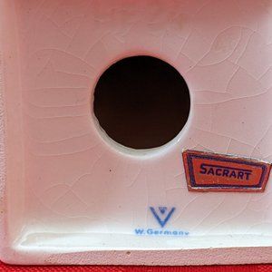 Unusual vintage figure of St. Joseph The Carpenter. It was issued in 1956, Goebel, W. Germany for SACRARTS. See Goebel "bee" mark. He stands nearly 8" tall on a 2" square base. Beautiful, refined facial features. Repair to his head, and there is overall crazing.