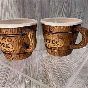 Vintage 1958 Treasure Craft Pottery Mugs Barrel Design MCM Set of 2