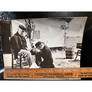 This poignant vintage still captures a heartfelt moment from the classic 1959 film "A Dog of Flanders." Featuring David Ladd and Donald Crisp, the scene evokes deep emotion, portraying a tender connection amidst the simplicity of their surroundings. A nostalgic treasure for classic cinema enthusiasts.