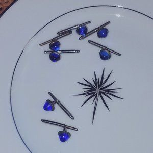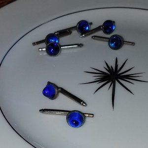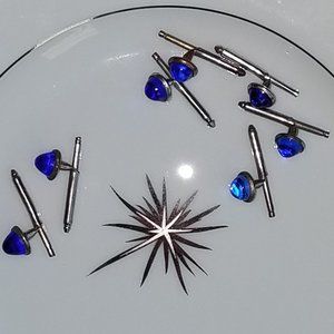 Vintage/retro tuxedo shirt button slides in great condition! All slide and spring-back except one, which slides but does not spring back. Doesn't seem like it would affect it's use, however. Raised resin domes in vibrant cobalt blue. Two of the button slides have higher domes than the others (maybe these are for the cuffs?). The remaining five domes are not as high, though one of the five is higher than the other four, but not as high as the two highest (maybe this is for the top of the neck??).