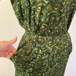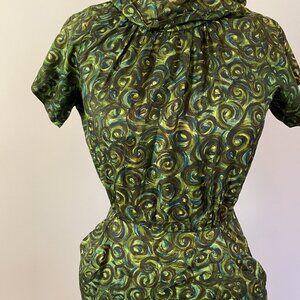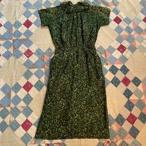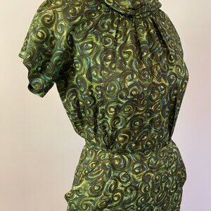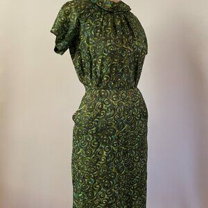 🌵Gorgeous 1960s wiggle dress with the most beautiful green swirl novelty print. Very Joan from Mad Men. I love the ruffle collar and fitted waist and bodice. Back zip and hook and eye closures at the top neck. Metal zipper, slides up and down with ease. Stitching to keep the collar down came apart so I did tack this down myself. Lots of allowance in the hem so this can be brought up or down depending on how you would like it to fit. Beautifully hand made and has pockets! 🌵Condition: Great vintage condition, no stains rips or holes. Back zip slides up and down with ease. Does no come with waist belt. 🌵Fiber Content: 100% rayon 🌵 Size (measurements taken laid flat, please double for body fit): ❉ Will best fit a modern Small ❉ 18 inches pit to pit ❉ 13 inches at the waist, no stretch ❉ 15 inch bodice length ❉ 41 inches long ❉ 18 inches at the hip