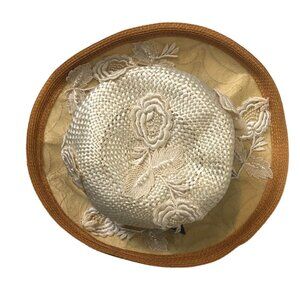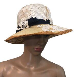 Vintage 1960S/70S Cream Tan Laurel Lace Appliqué Woven Sun Hat