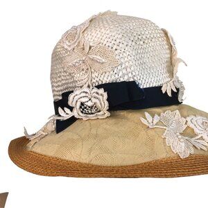 Overall good vintage condition! There is some light discoloration on the rim of the interior, where the head would meet the hat from previous use. Mix of textures is fantastic. Woven sun hat with the floral lace appliqué accents as well as pearl. Navy blue ribbon. Additional texture on the inside brim. Lovely vintage sun hat. Genuine vintage. It looks as though the label came undone, and the original owner glued it back in.
